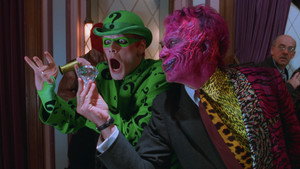 Batman faces off against two foes: the schizophrenic, horribly scarred former District Attorney Harvey Dent, aka Two-Face, and the Riddler, a disgruntled ex-Wayne Enterprises inventor seeking revenge against his former employer by unleashing his brain-sucking weapon on Gotham City's residents. As the caped crusader also copes with tortured memories of his parents' murder, he has a new romance, with psychologist Chase Meridian.